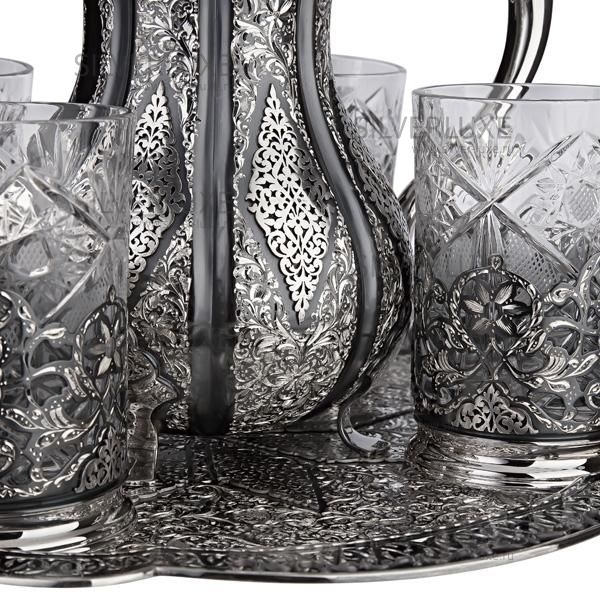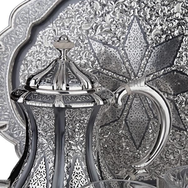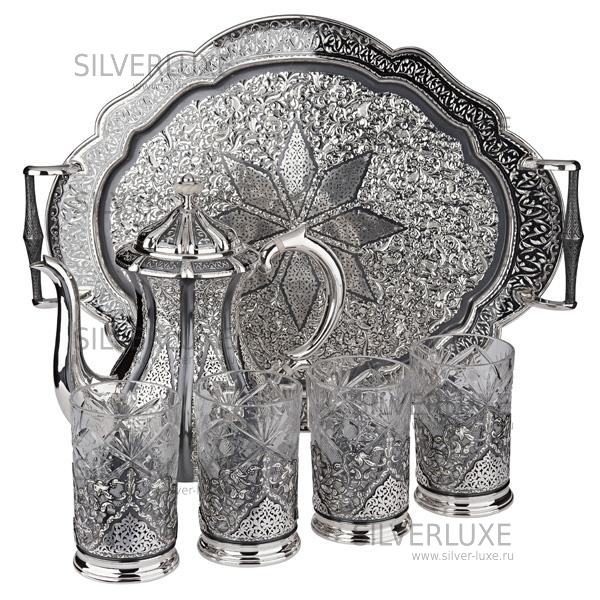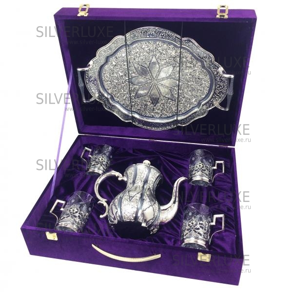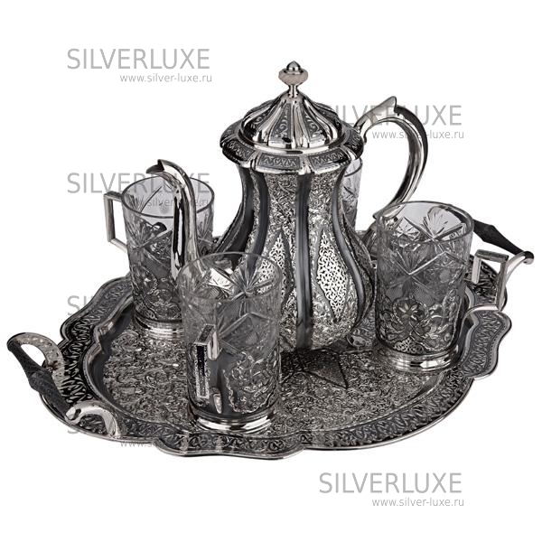 Серебро 875 пробы. Сервиз на 4 персоны. В сервиз входят: чайник, поднос с ручками и 4 подстаканника. Выполнено ювелирам Кубачи! Гарантия высшего качества от фирменного магазина!