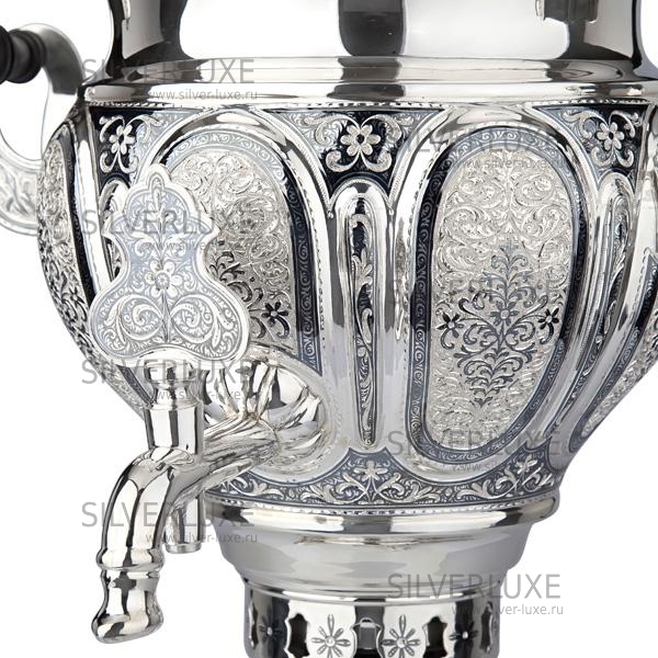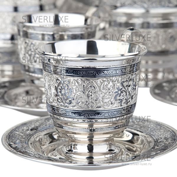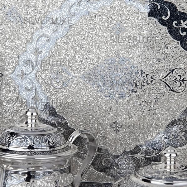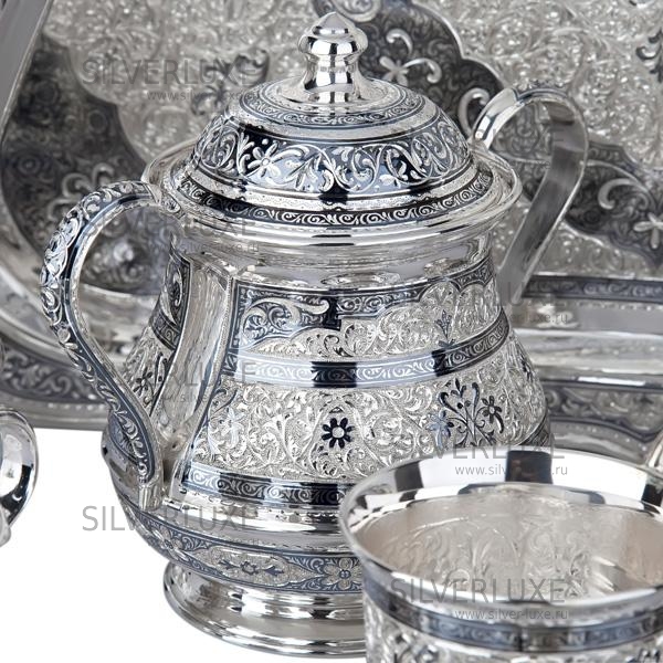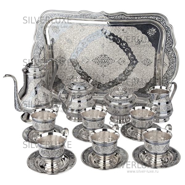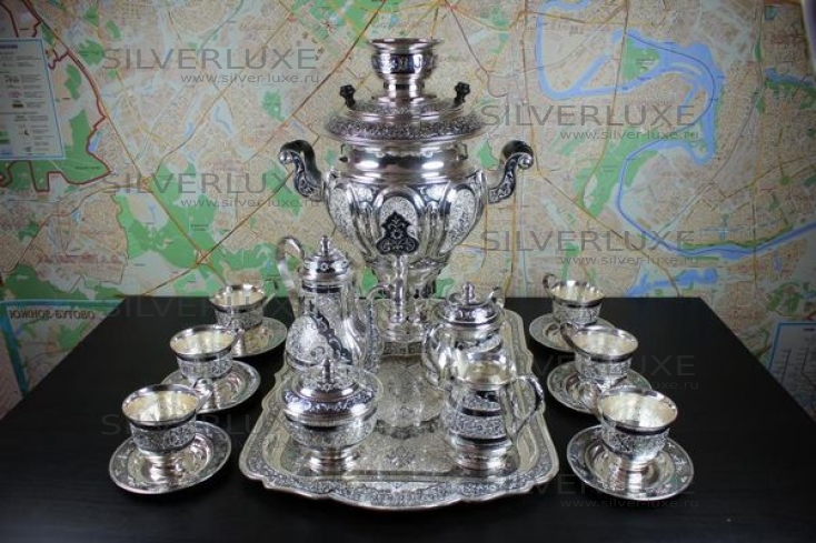 Серебро 875 пробы. В премиумном исполнении от кубачинских мастеров ! В сервиз входят - самовар электрический, чайник , поднос , чашки с блюдцем 6 пар, молочник , сахарница , конфетница.