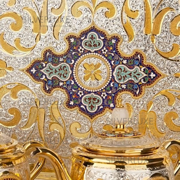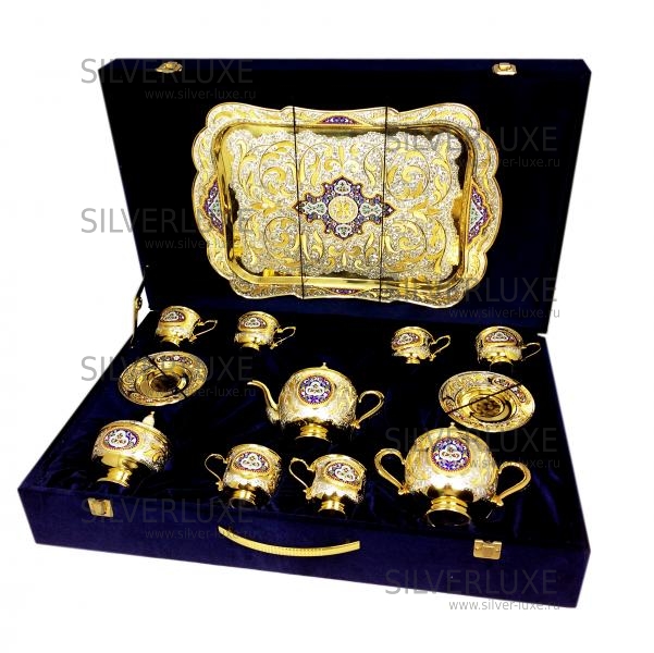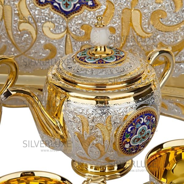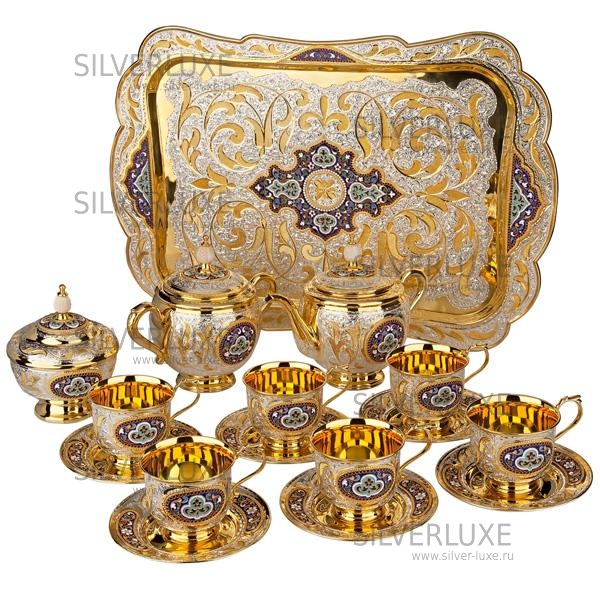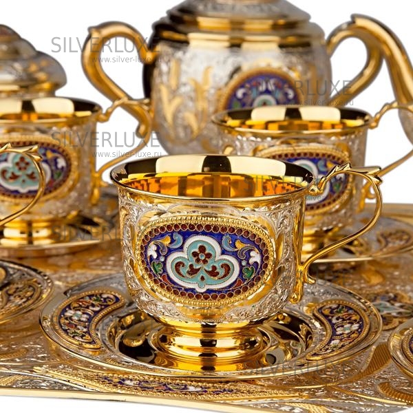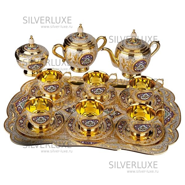 Серебро 875 пробы. Покрыт золотом 999 пробы. Чайный сервиз на 6 персон. В сервиз входят: чайник, сахарница, конфетница, поднос, 6 пар чашек с блюдцем.
