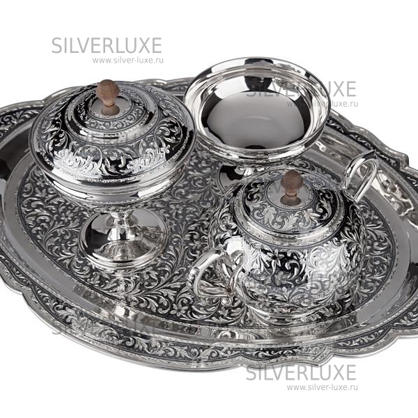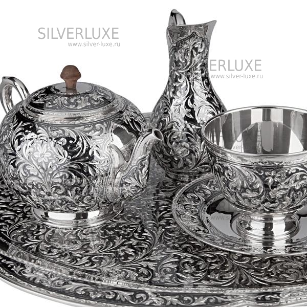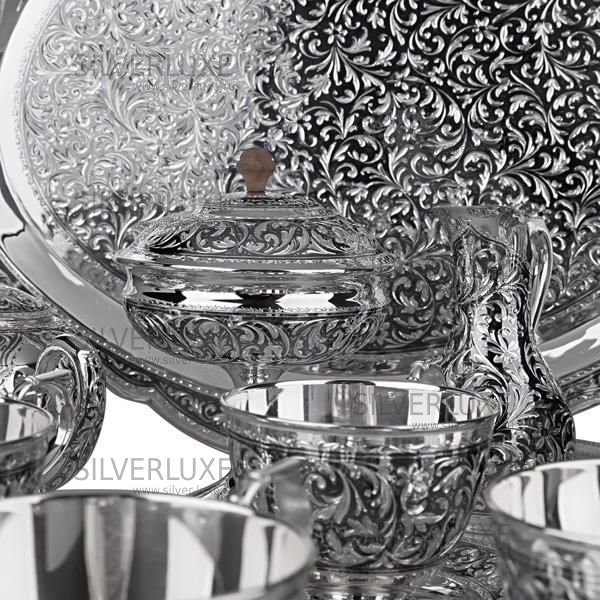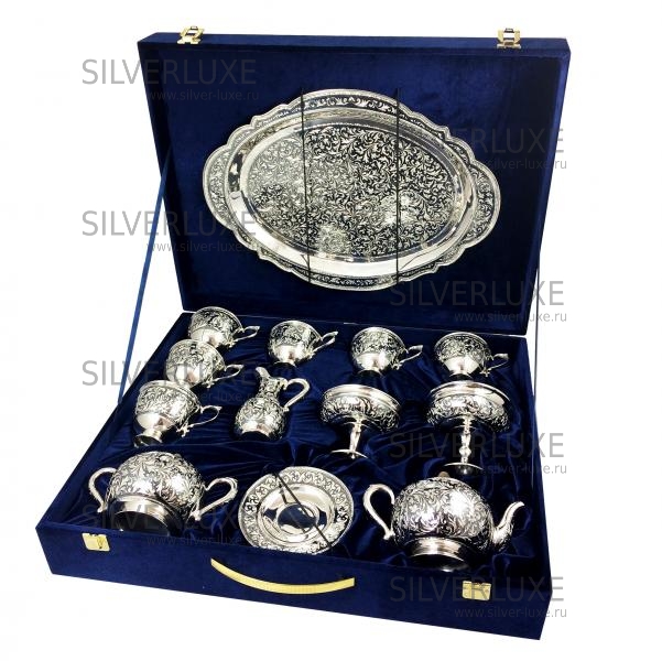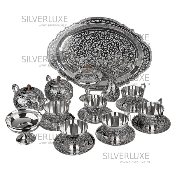 Серебро 875 пробы. Великолепный чайный сервиз из серебра ручной работы,в исполнении люкс плюс! Для роскошного чаепития, для дорогих гостей! Гарантия высшего качества от фирменного магазина! В сервиз входит чайник, сахарница, вареньица, креманка с крышкой, молочник, поднос , чашки с глубокими блюдцами 6 пар.