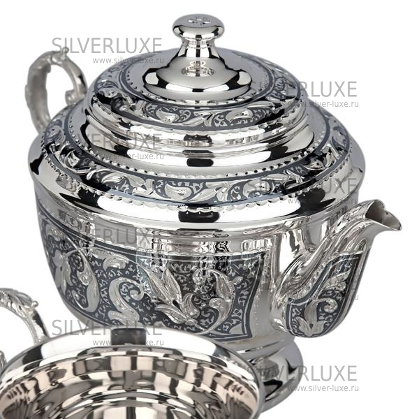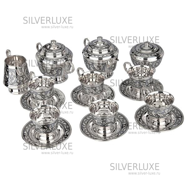 Серебро 875 пробы. В сервиз входит : чашки с блюдцем 6 пар, чайник, сахарница , конфетница, молочник.