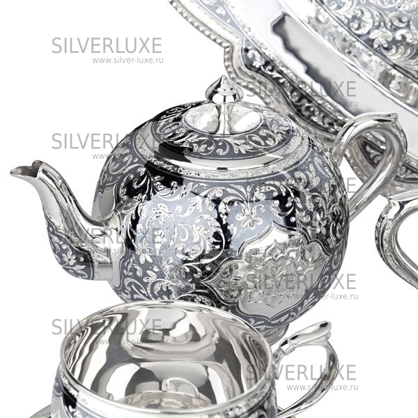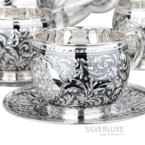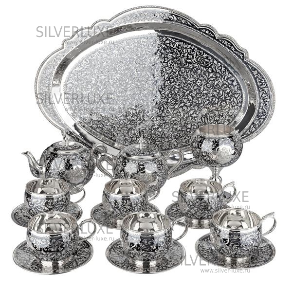 Серебро 925 пробы. В сервиз входят: чайник, сахарница, поднос, вареньица, 6 пар чашек с блюдцем. Роскошный набор от кубачинских ювелиров! Гарантия высшего качества от фирменного магазина!
