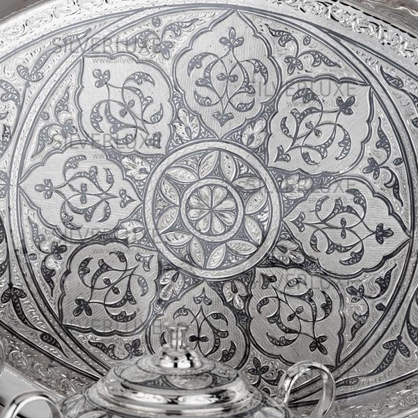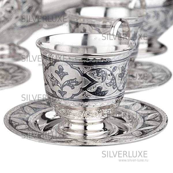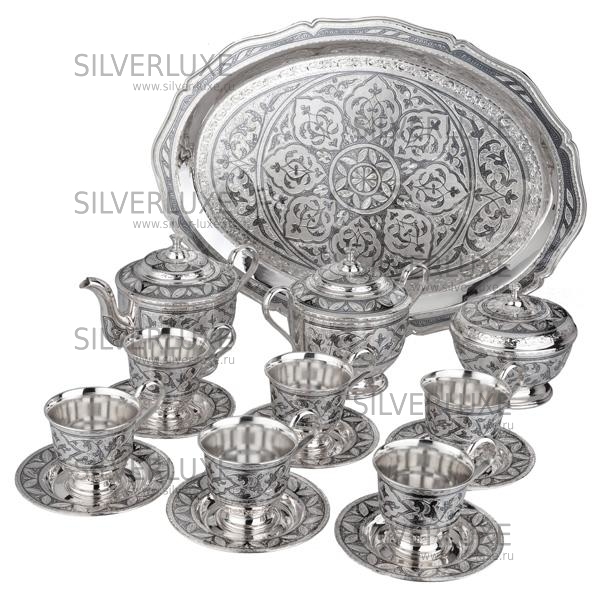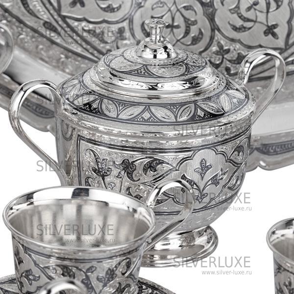 Серебро 875 пробы. В сервиз входят: чайник, сахарница, конфетница, поднос с ручками, 6 пар чашек с блюдцем.