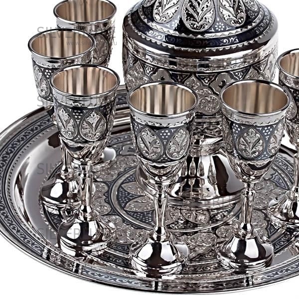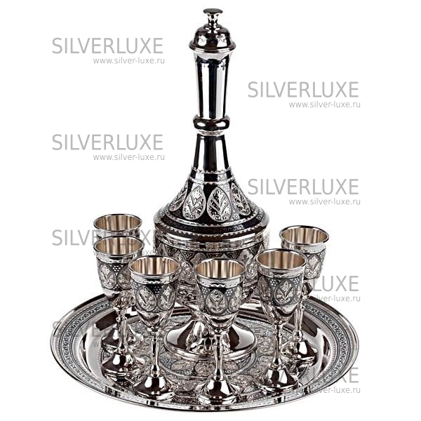 Серебро 875 пробы. В премиумном исполнении от кубачинских мастеров! В сервиз входят: графин, поднос и 6 рюмок.