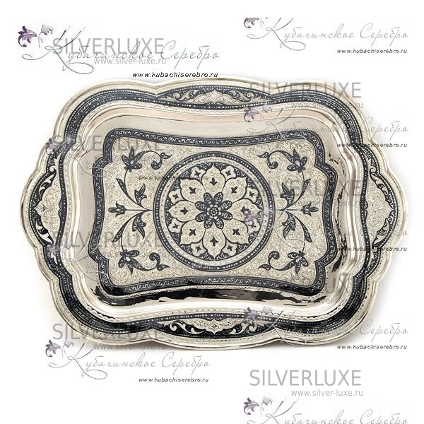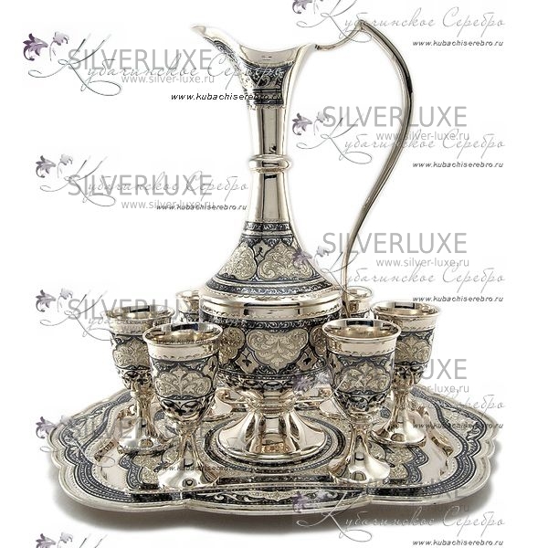 Серебряный 875 пробы. Великолепный коньячный сервиз от Кубачинских ювелиров,в премиумном исполнении! В сервиз входят: кувшин,поднос и 6 рюмок. "Кубачи" по праву является брендом в мире эксклюзивных ювелирных произведений из серебра.