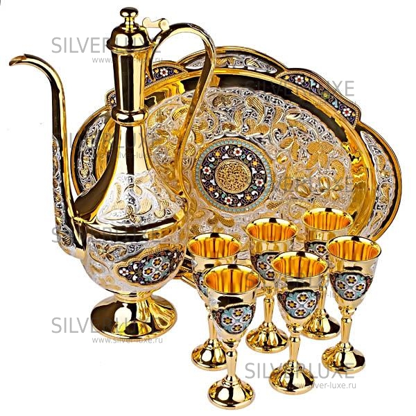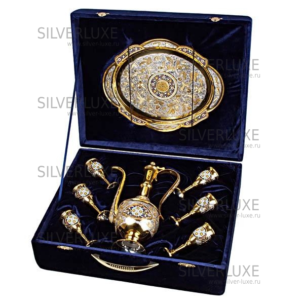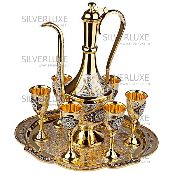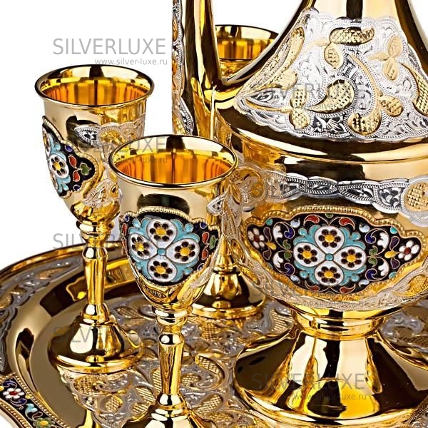 Серебро 875 пробы. Покрыт золотом 999. В сервиз входит - кувшин, поднос и 6 рюмок. Гарантия высшего качества!