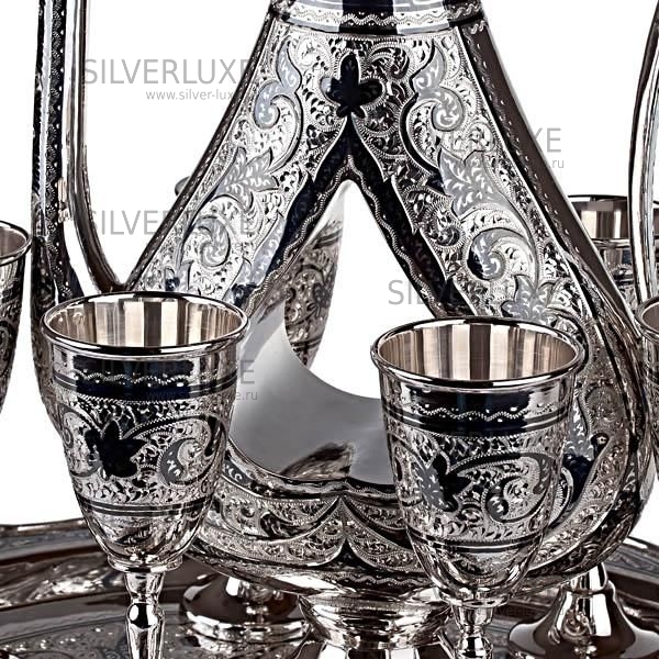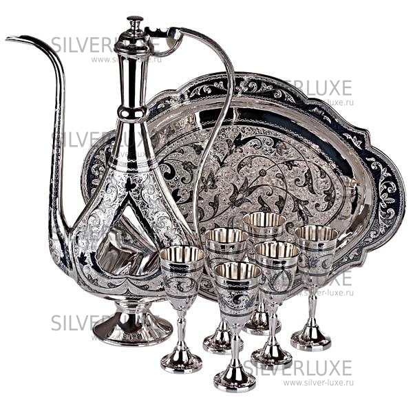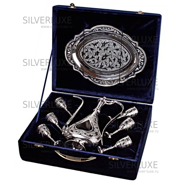 Серебро 875 пробы. В сервиз входят: кувшин, поднос и 6 рюмок. От кубачинских ювелиров в исполнении "Эксклюзив". Гарантия высшего качества!