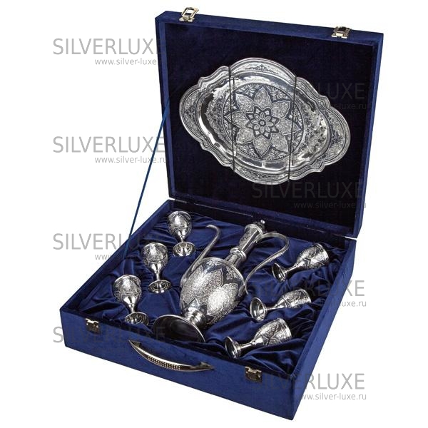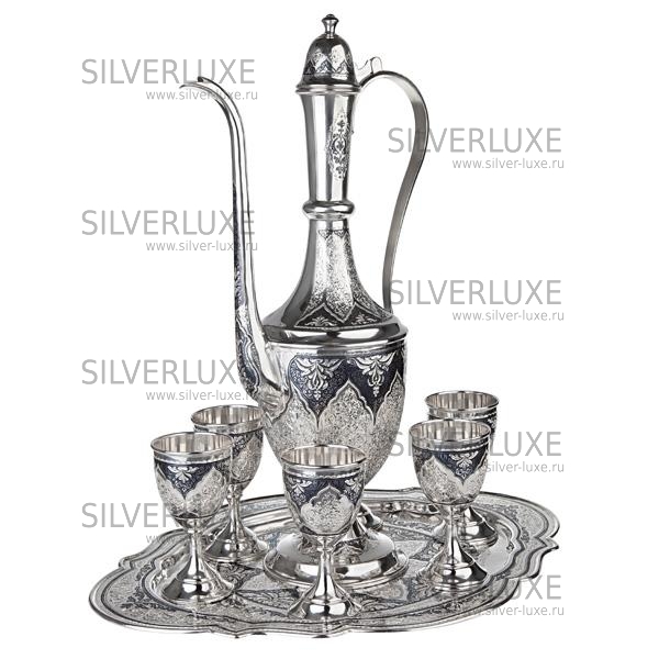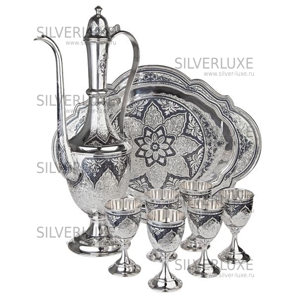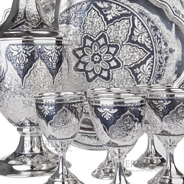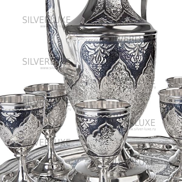 Серебро 875 пробы. В сервиз входит винный кувшин, поднос и 6 бокалов. .В люксовом исполнении от кубачинских ювелиров! Гарантия высшего качества от фирменного магазина!