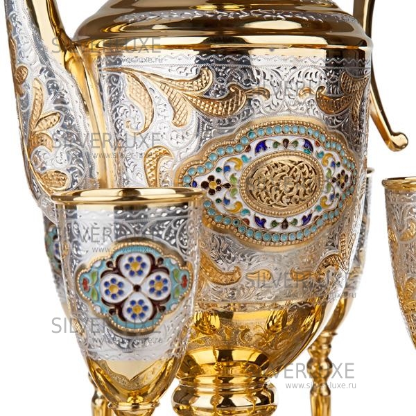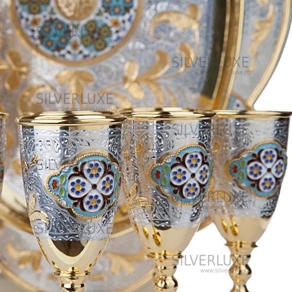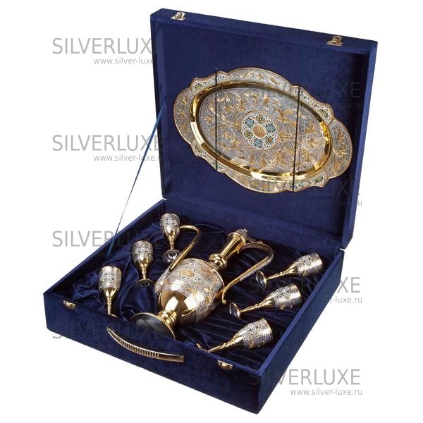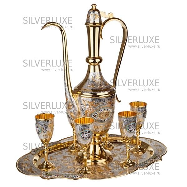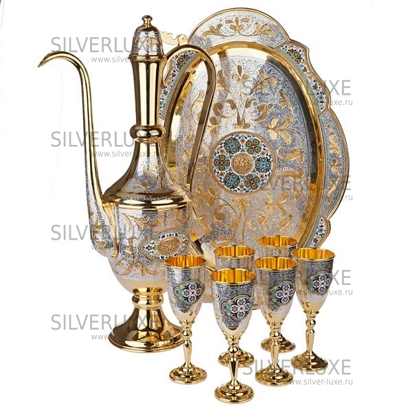 Серебро 875 пробы, покрыт золотом 999 пробы. В сервиз входят: кувшин, поднос, 6 бокалов. Гарантия высшего качества от кубачинских ювелиров!