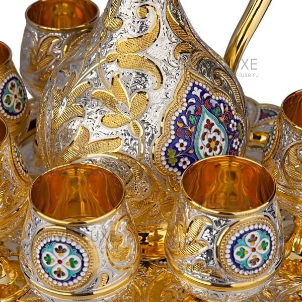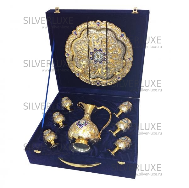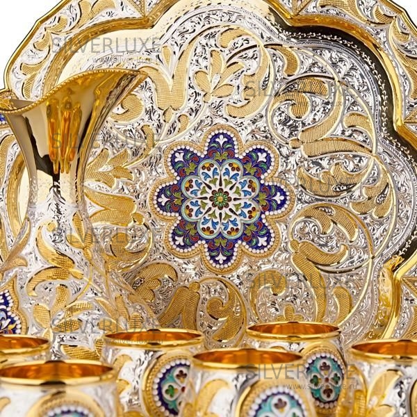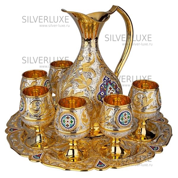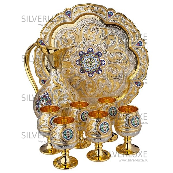 Серебро 875 пробы. Покрыт золотом 999 пробы, с горячей эмалью! В сервиз входят: кувшин, поднос и 6 бокалов. Ручная работа от кубачинских мастеров! Гарантия высшего качества!