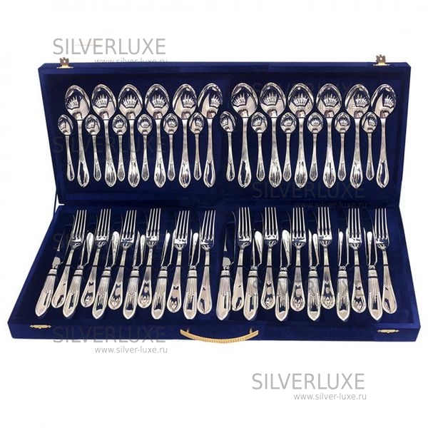Серебро 925 пробы. В набор входят: ложки столовые 12 шт, ложки чайные 12 шт, вилки столовые 12 шт , ножи столовые 12 шт.