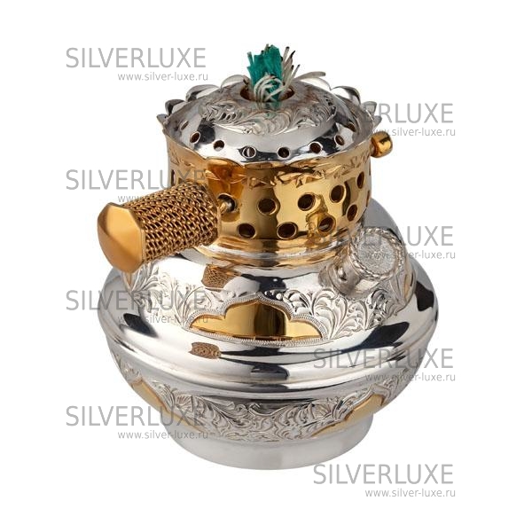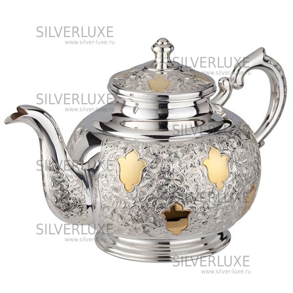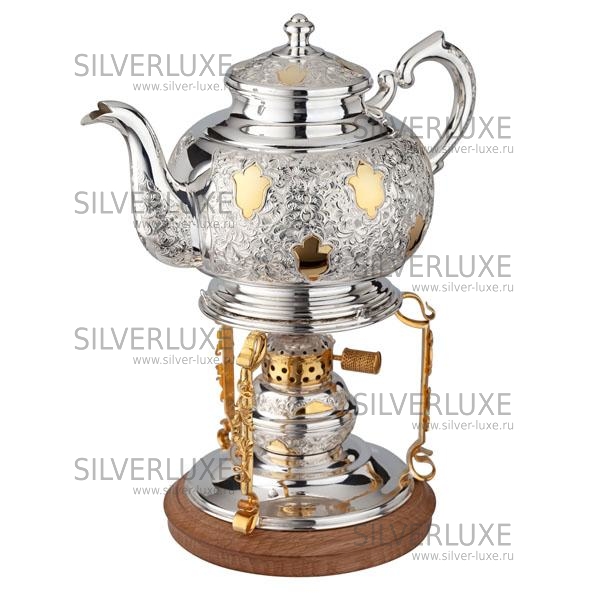 Серебро 925 пробы, покрыт позолотой 999 пробы, посеребрен внутри и снаружи 999 пробы. Бульотка (самовар) - сосуд для кипятка, предназначенный для сервировки чайного стола и поддержания необходимой температуры воды. Бульотка представляет собой металлическую ёмкость с крышкой на подставке, снабжённую ручкой и носиком, как у чайника, или же сливным краником, как у самовара. Бульотка предназначалась для сервировки чайного стола, но не для кипячения воды, а лишь для поддержания температуры кипятка.