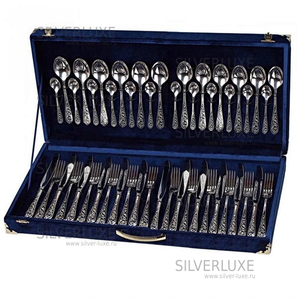 Серебро 925 пробы. Фирменный столовый набор компании "Кубачинское серебро" на 12 персон . В набор входят: ложки столовые 12 шт, ложки чайные 12 шт, вилки столовые 12 шт, ножи столовые 12 шт.
