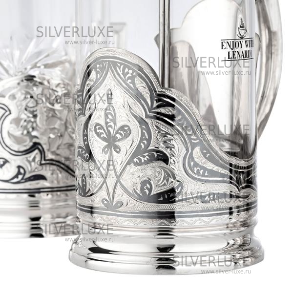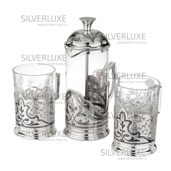Серебро 875 пробы. В набор входят: заварочный чайник (френч-пресс) со стеклянной колбой из жаропрочного стекла и 2 подстаканника (стаканы в комплекте). Гарантия вышего качества от фирменного магазина!