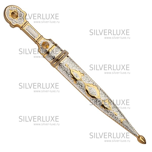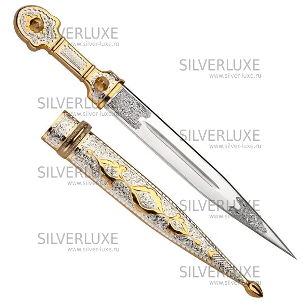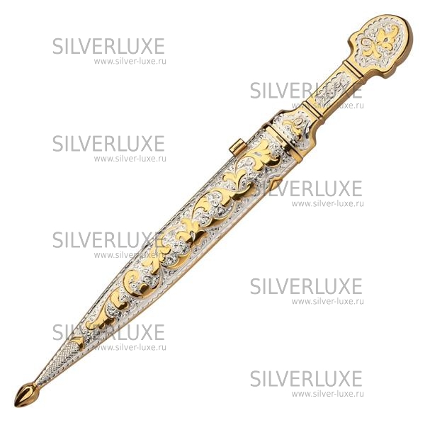 Серебряный 875 пробы, с позолотой 999 пробы. Клинок - кизлярская сталь. Средний вес серебра в изделии 100 гр. Гарантия высшего качества от фирменного магазина!