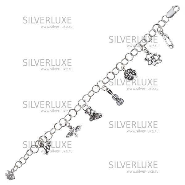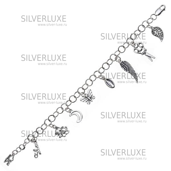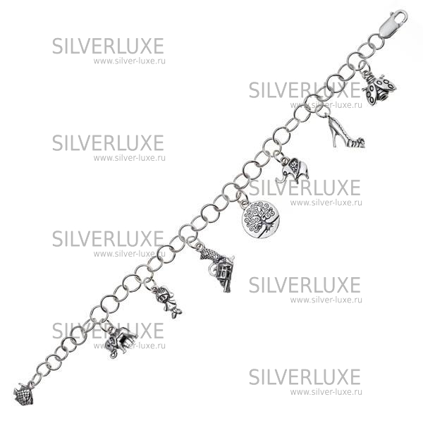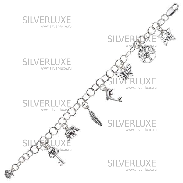 Серебро 925 пробы. Миниатюрные украшения прикреплены к браслету, не съёмные. В наличии браслеты с разной комбинацией: полумесяц, цветок, туфля, ключ, дельфин и др. Изделие в подарочной упаковке.