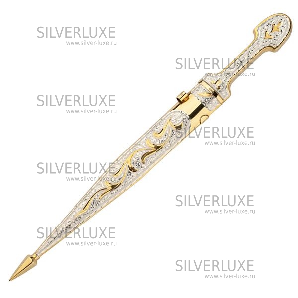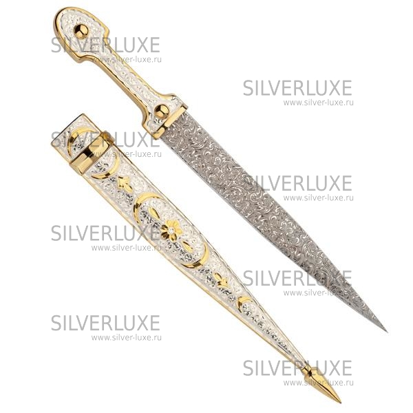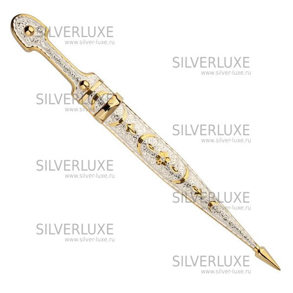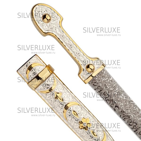 Серебряный 875 пробы, с позолотой 999 пробы. Клинок - кизлярская сталь. Средний вес серебра в изделии 50 гр. Гарантия высшего качества от фирменного магазина!