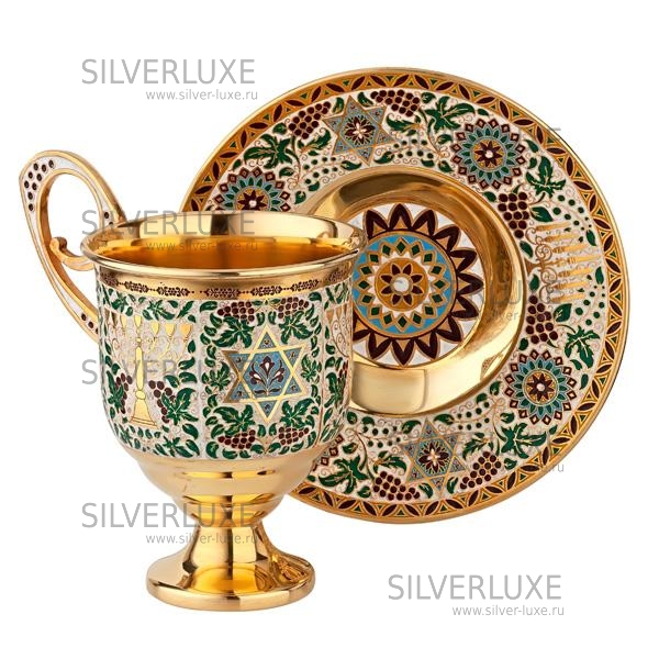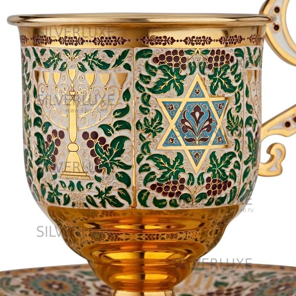 Серебро 925 пробы, с позолотой 999 пробы. С холодной эмалью. На изделии представлена звезда Давида и семисвечник менора.