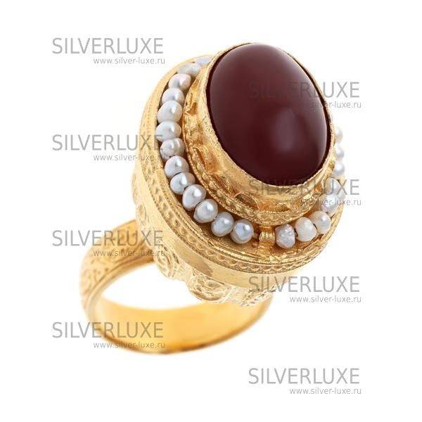 Кольцо кубачинское высокое с сердоликом и мелким жемчугом артикул: 6751