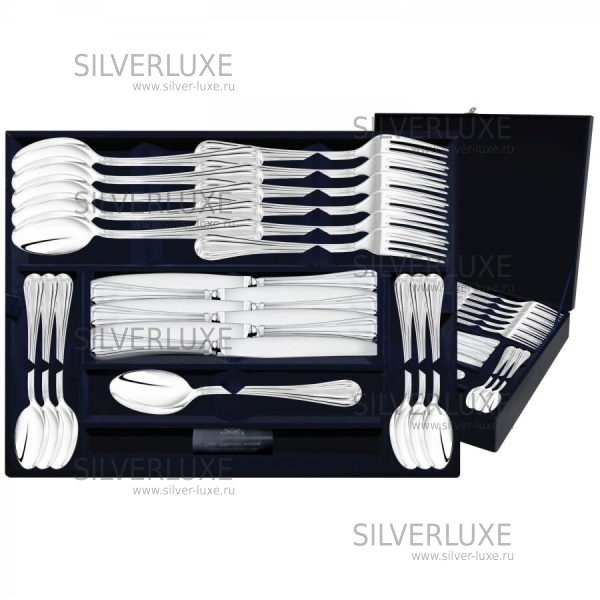 Серебро 925 пробы. Фабрика серебра "Аргента". В набор входят: ложки столовые 12 шт, ложки чайные 12 шт, вилки столовые 12 шт, ножи столовые 12 шт. Клинок ножа - нержавеющая сталь. Коллекция классического столового серебра - это союз многовековых традиций и современных технологий, эстетичных форм и эргономичного дизайна. Все предметы коллекции созданы, чтобы стать заветными семейными ценностями и передаваться из поколения в поколения. Стильные и полезные, серебряные столовые приборы помогают победить негативное воздействие внешней среды и укрепляют иммунитет всей семьи день за днём.
