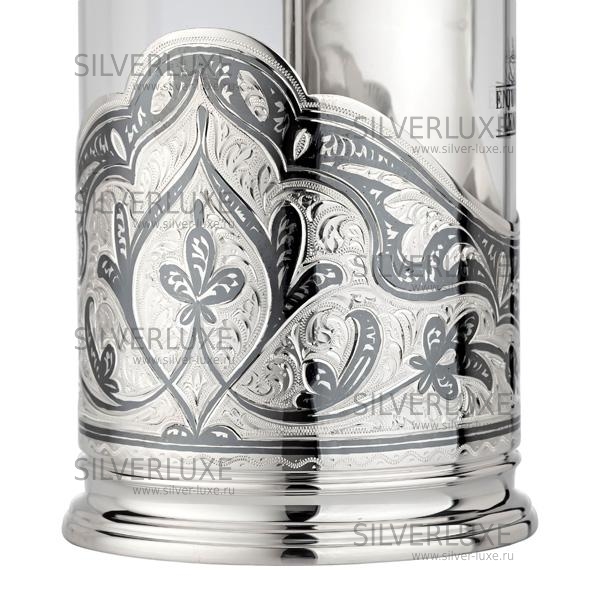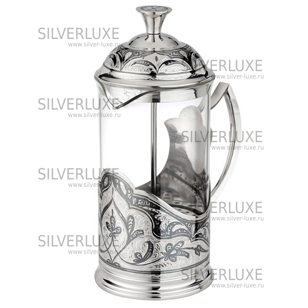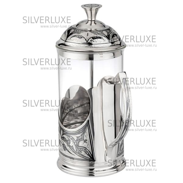 Заварочный чайник (френч-пресс), корпус из серебра 875 пробы. С колбой из жаропрочного стекла. Вставка с позолотой 999 пробы и холодной эмалью.