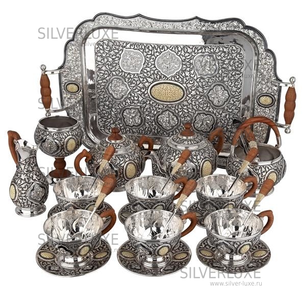 Серебро 875 пробы. Вставки- кость моржа, дерево кавказский дуб. В сервиз входят: чайник, сахарница, поднос, вареньица, конфетница, молочник, 6 пар чашек с блюдцем, чайные ложки 6 штук, щипцы. Роскошный набор от кубачинских ювелиров! Гарантия высшего качества от фирменного магазина!!