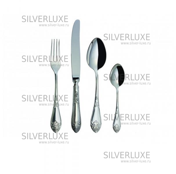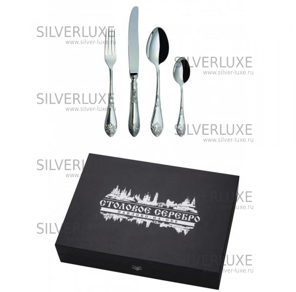 Серебро 925 пробы. ПАО "Павловский завод им.Кирова". В набор входят: ложка чайная - 6 шт., ложка столовая – 6 шт., вилка столовая – 6 шт., нож столовый – 6 шт.