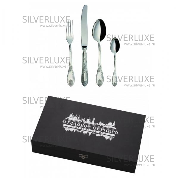 Серебро 925 пробы. ПАО "Павловский завод им.Кирова". В набор входят: ложка чайная - 1 шт., ложка столовая – 1 шт., вилка столовая – 1 шт., нож столовый – 1 шт.