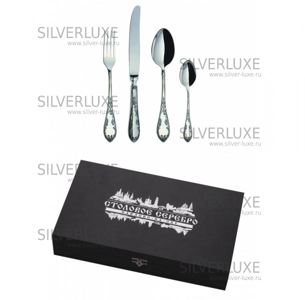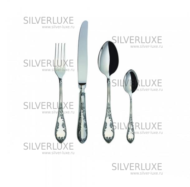 Серебро 925 пробы. ПАО "Павловский завод им.Кирова". В набор входят: ложка чайная - 1 шт., ложка столовая – 1 шт., вилка столовая – 1 шт., нож столовый – 1 шт.