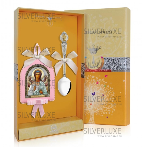Детский набор состоит из серебряной ложки "Ангел-Хранитель" 925 пробы с позолотой и с иконой "Ангел Хранитель". Икона изготовлена по технологии вакуумного напыления серебра, основа - МДФ. Такой набор станет отличным подарком на рождение ребенка или крестины. Фабрика серебра "Аргента".
