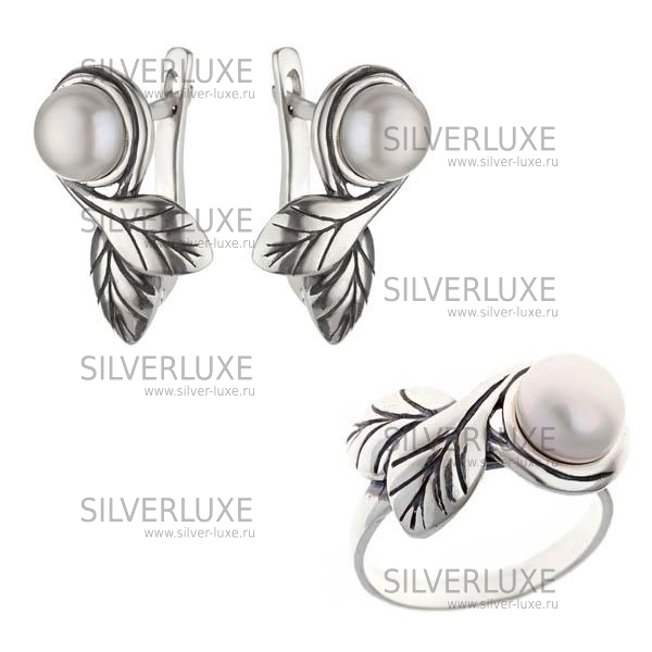 Серебряный комплект с жемчугом в листьях артикул: 4489