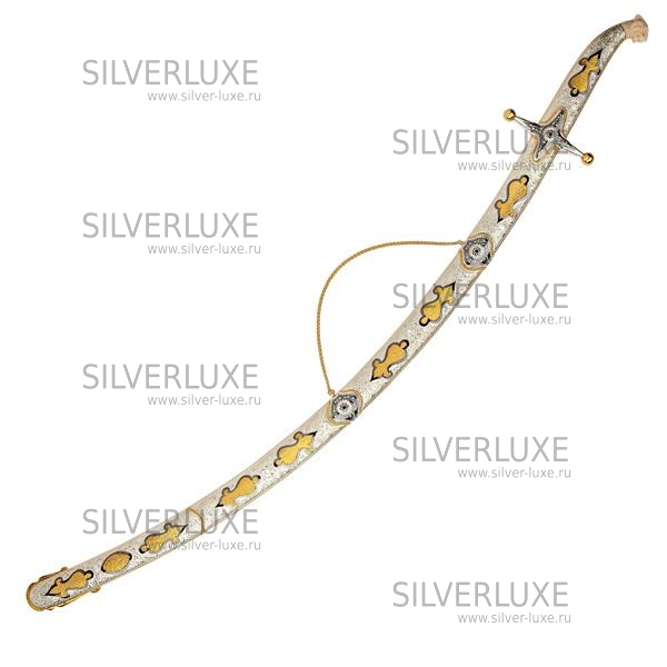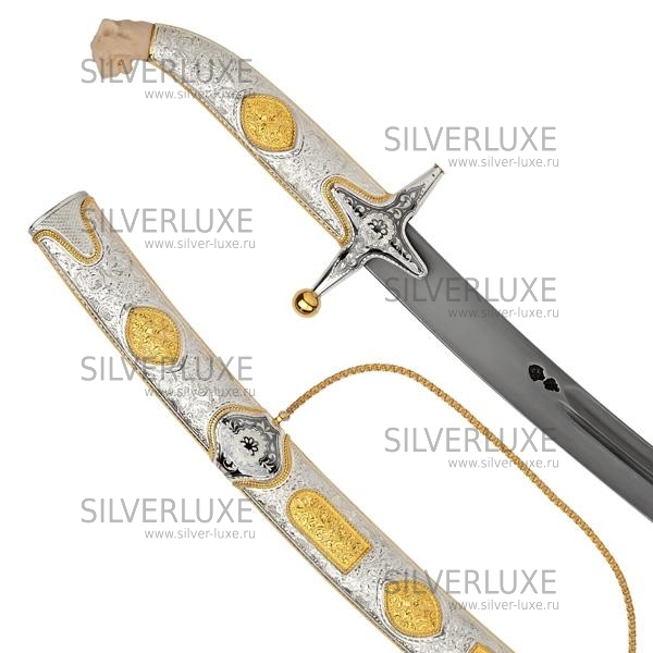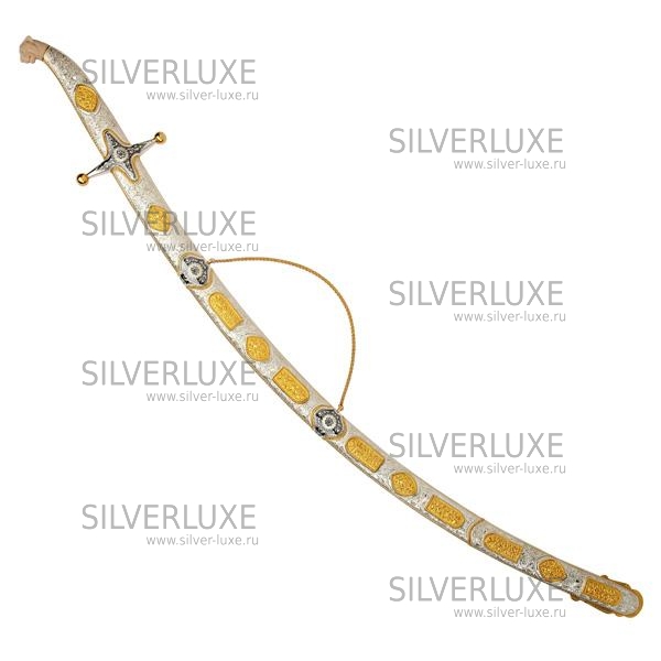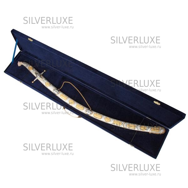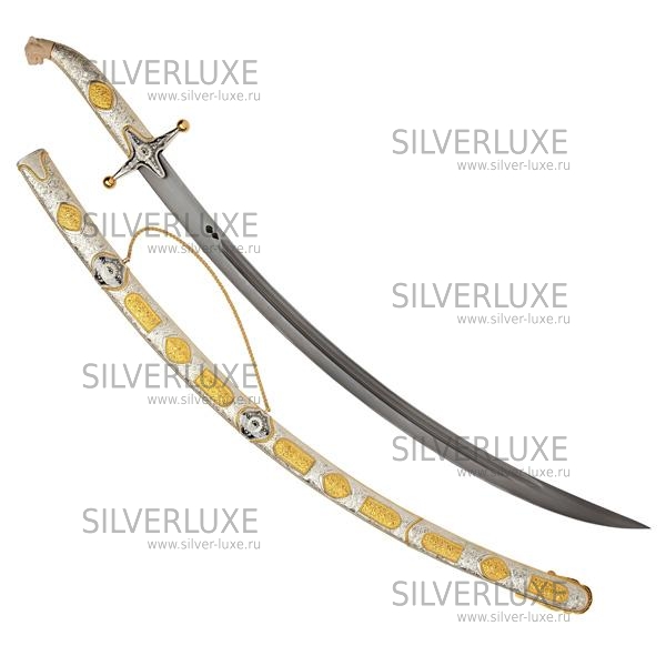 Серебро 875 пробы. Покрыт золотом 999 пробы. Клинок - каленая сталь. Средний вес серебра в изделии 350 гр. Гарантия высшего качества от фирменного магазина!