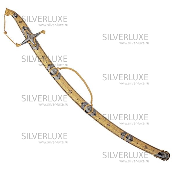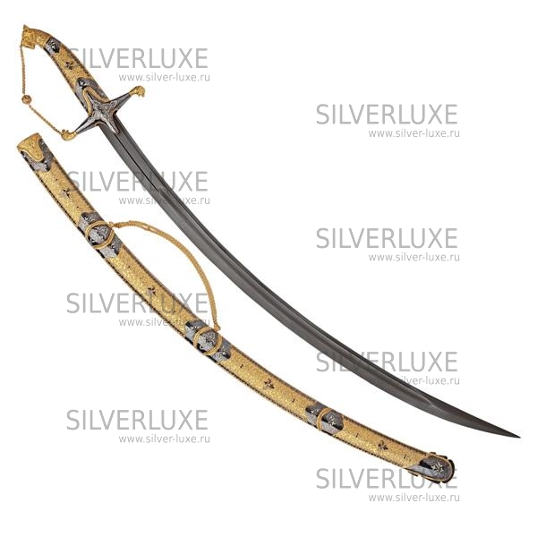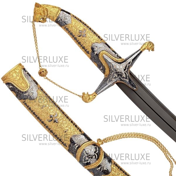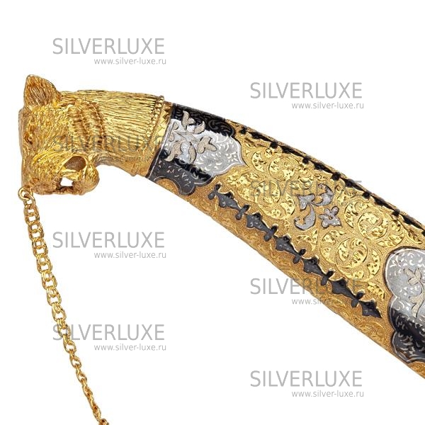 Серебро 875 пробы. Покрыт золотом 999 пробы. Клинок - каленая сталь, рубит гвозди. Средний вес серебра в изделии 350 гр. Гарантия высшего качества от фирменного магазина!