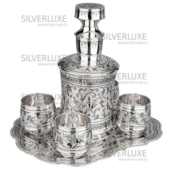 Серебро 875 пробы. В сервиз входят: графин, поднос, 4 стакана.В эксклюзивном исполнении от кубачинских ювелиров! Гарантия высшего качества от фирменного магазина!
