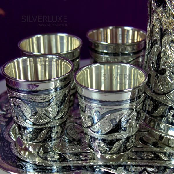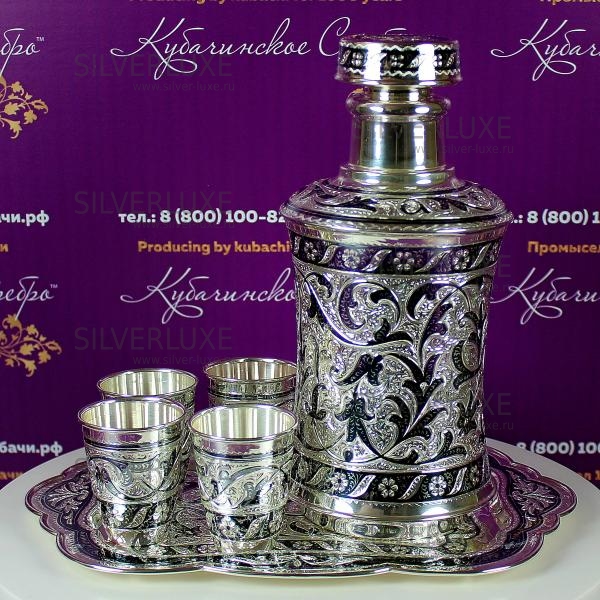 Серебро 875 пробы. В сервиз входят: графин, поднос, 4 стопки. В эксклюзивном исполнении от кубачинских ювелиров! Гарантия высшего качества от фирменного магазина!