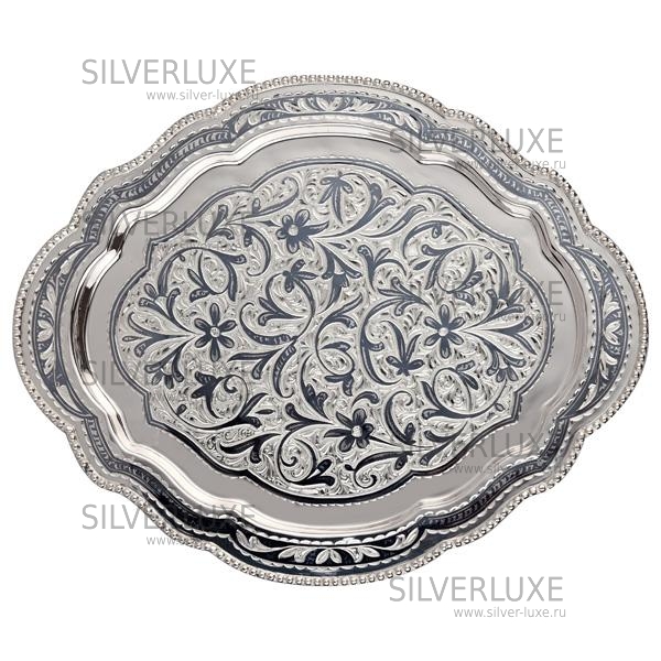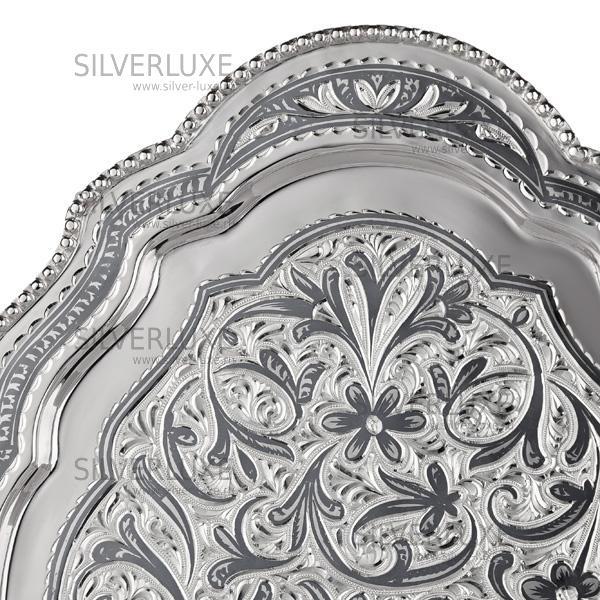 Серебряный 875 пробы. Поднос подойдет под графин и три стопки или рюмки.Рисунок- фантазия ювелира, каждый раз новый.
