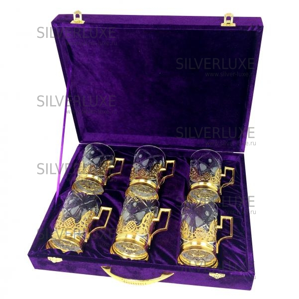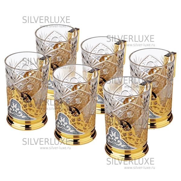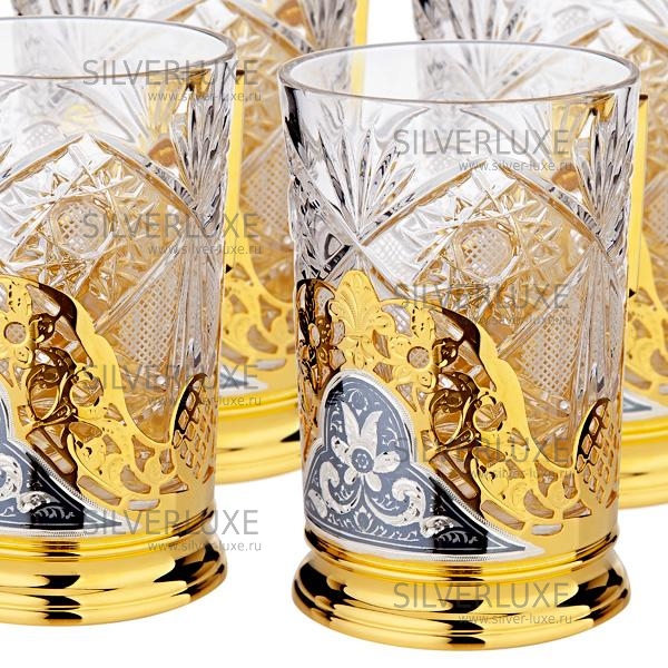Серебро 875 пробы. Покрыт золотом 999 пробы. Стаканы в комплекте.