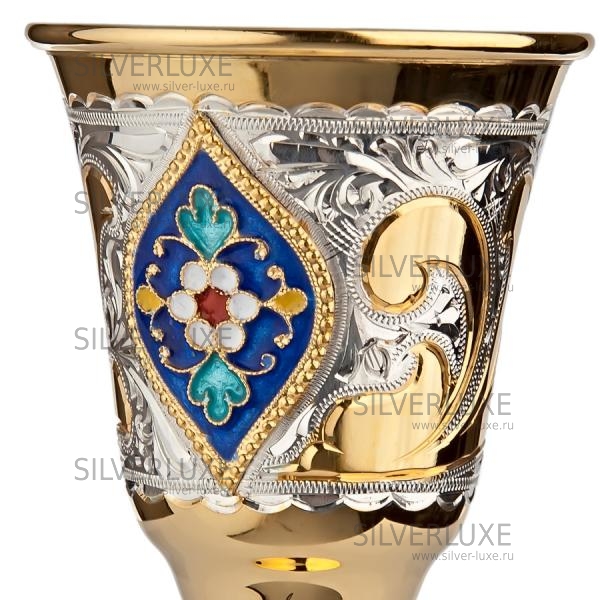 Рюмки из серебра кубачинских мастеров имеют не только интересный дизайн, но и несут в себе определенный смысл. Предлагаем вам недорого купить рюмки с позолотой и эмалью объемом 50 мл. Авторская работа подчеркивает изящный стиль рюмки Кубачи.