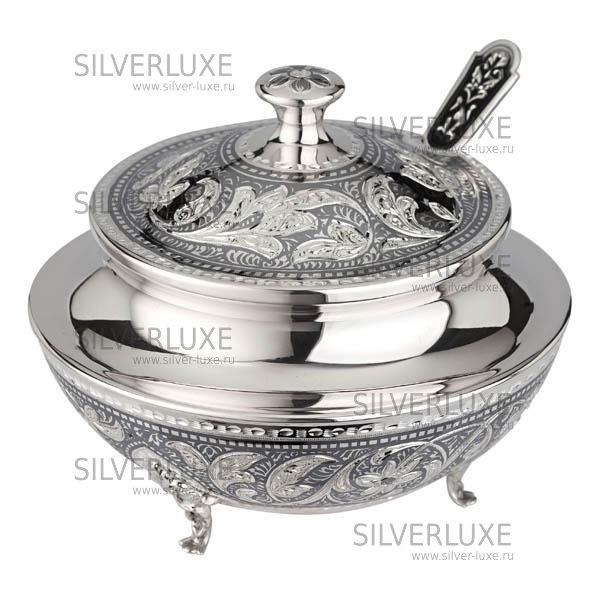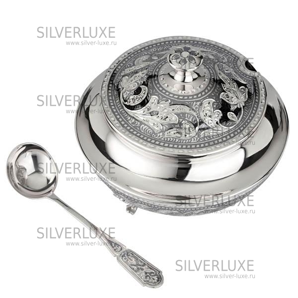 Серебро 875 пробы. В набор входят: сахарница объемом 500 мл и ложка.