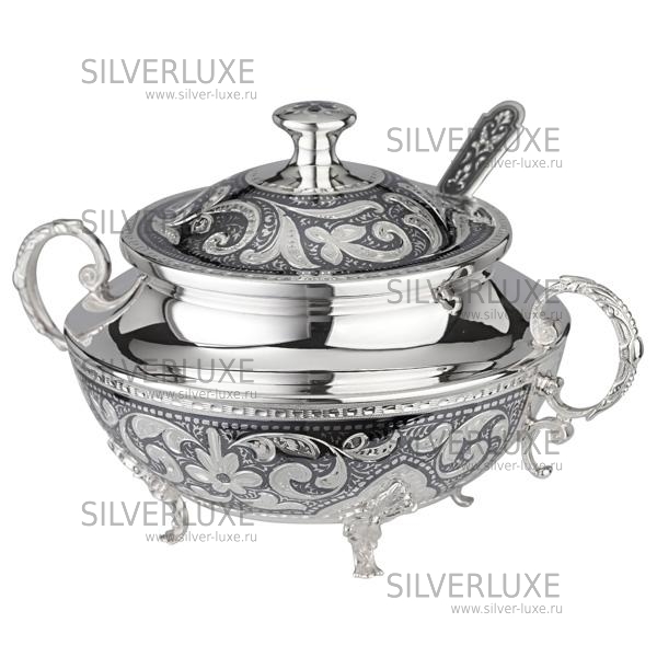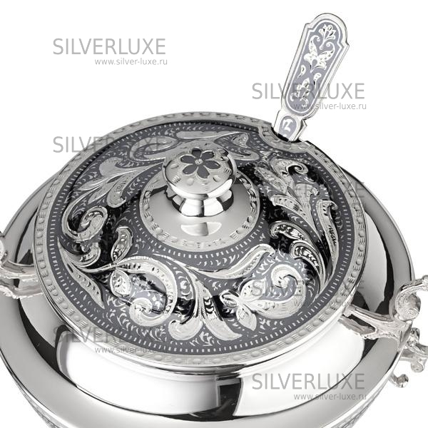Серебро 875 пробы. В набор входят: сахарница объемом 500 мл и ложка.