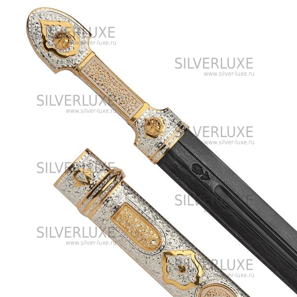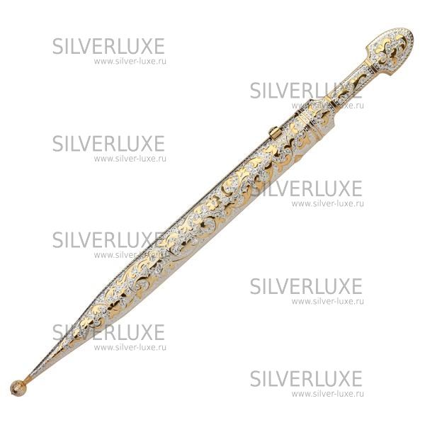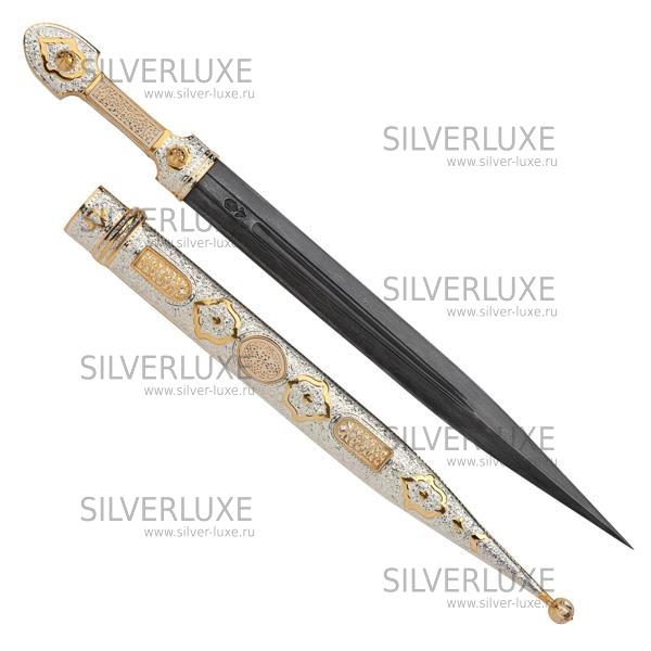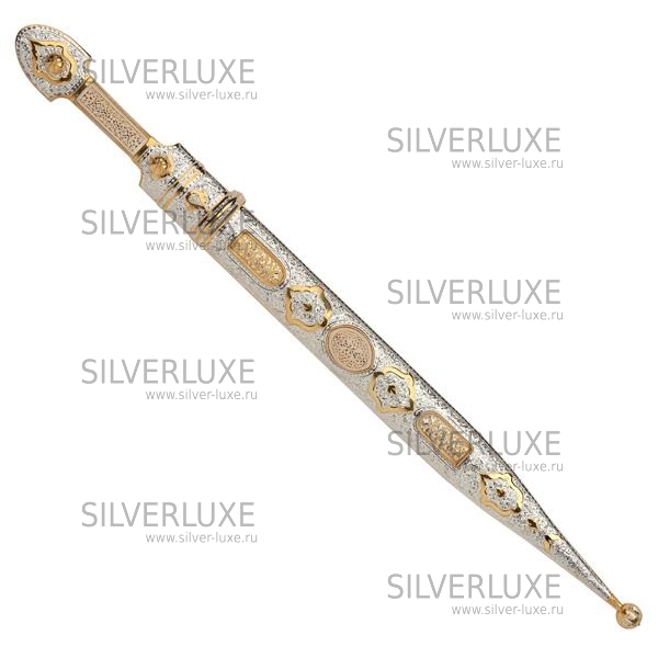 Серебро 875 пробы, покрыт золотом 999. Клинок - дамасская сталь! Вставка слоновая кость. Средний вес серебра в изделии 300 гр Гарантия высшего качества от фирменного магазина!