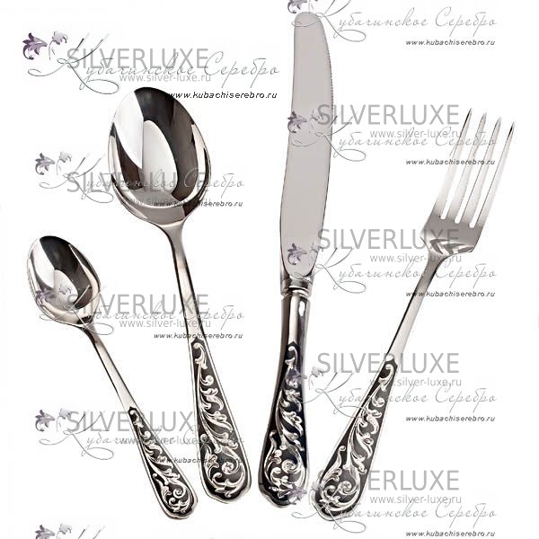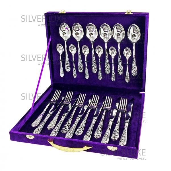 Праздничное застолье невозможно себе представить без креативного оформления интерьера помещения, где особое место занимает стол, и расположенные на нем столовые приборы. Интернет-магазин Silver Luxe предлагает вам принять правильное решение и купить серебряный столовый набор из 24 предметов на 6 человек. Такой столовый набор ы можете подарить молодоженам на свадьбу, юбилей коллеге, или на день рождение близким людям.