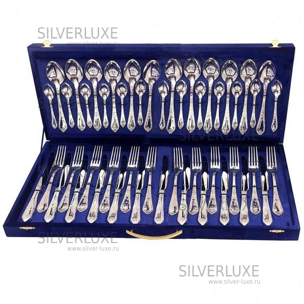 Серебро 925 пробы. В набор входят: ложки столовые 12 шт, ложки чайные 12 шт, вилки столовые 12 шт , ножи столовые 12 шт.