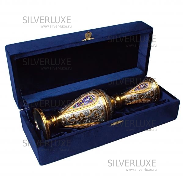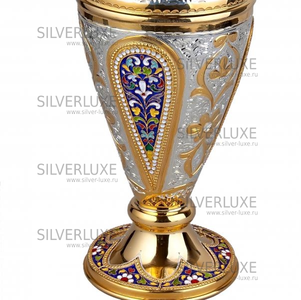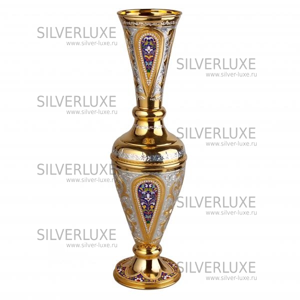 Серебро 875 пробы. Ваза покрыта золотом 999 пробы. С горячей эмалью! Изготовлена вручную кубачинскими мастерами! По древнейшим традициям, история Кубачинского искусства насчитывает несколько веков!Принципы обработки серебра традиционно держаться в секрете и передаются от отца к сыну.